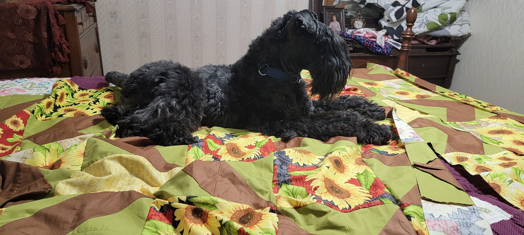 A kerry blue terrier laying on an unfinished quilt top.